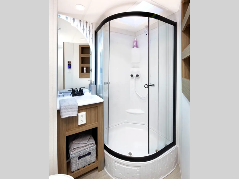 Sleeps 4 Slides 1 Length 33 ft 6 in Ext Width 8 ft Ext Height 11 ft 3 in Hitch Weight 955 lbs Dry Weight 6863 lbs Cargo Capacity 2892 lbs Fresh Water Capacity 40 gals Grey Water Capacity 54 gals Black Water Capacity 30 gals Available Beds Custom King Versa Tilt Refrigerator Type Oversized Number of Awnings 1 Water Heater Type Tankless AC BTU 13500 btu Awning Info 20' with 4K Blade Lighting Axle Count 2 Shower Type Walk-In Shower Electrical Service 30 amp Similar Floorplans