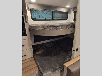 This Delta 291BH model offers a thoughtfully designed layout perfect for comfort and convenience on the road. At the front, you'll find a private bedroom featuring two nightstand wardrobes, and additional overhead storage for all your essentials. Moving through the walk-through bathroom, enjoy a 30" x 36" shower and a soft-close porcelain toilet with foot flush. The central living area is ideal for relaxing or entertaining, with a 68" theater seat that has the option to be a tri-fold sleeper sofa for added sleeping space if needed. Along with a L-shaped dinette, and a 36" ottoman, all centered around a 40" TV. At the rear we have, two 46" x 74" bunks with steps that provide extra-sleeping space and easy accessibility along with a wardrobe for added storage, making this RV perfect for families or group travel.