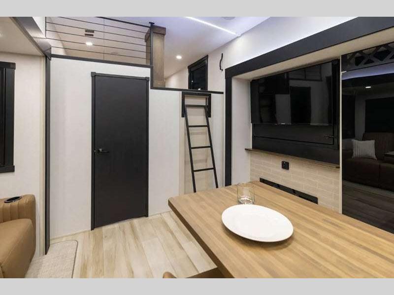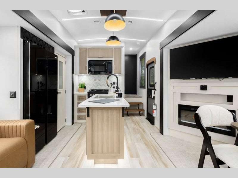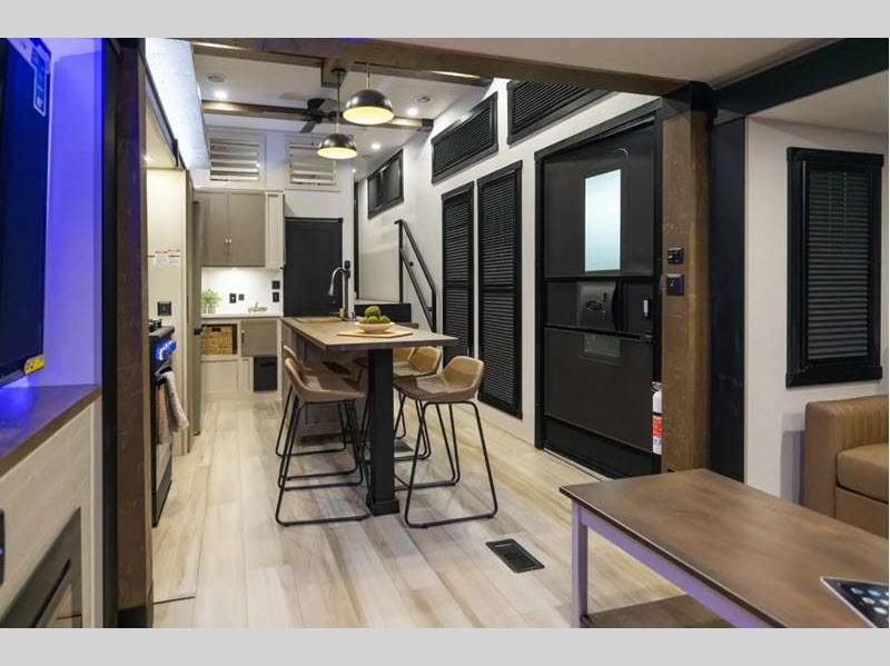Sleeps 8 Slides 2 Length 37 ft 10 in Ext Width 8 ft Ext Height 13 ft 3 in Hitch Weight 1985 lbs Dry Weight 10064 lbs Cargo Capacity 3921 lbs Fresh Water Capacity 57 gals Grey Water Capacity 62 gals Black Water Capacity 30 gals Number Of Bunks 2 Available Beds Custom King Refrigerator Type 12V Refrigerator Size 16 cu ft Cooktop Burners 3 Number of Awnings 1 Water Heater Type On Demand Tankless AC BTU 15000 btu TV Info LR 50" LED Smart TV Awning Info 9' 6" and 18' Electric with LED Lights Axle Count 2 Washer/Dryer Available Yes Shower Type Walk-In Shower Electrical Service 50 amp Similar Floorplans