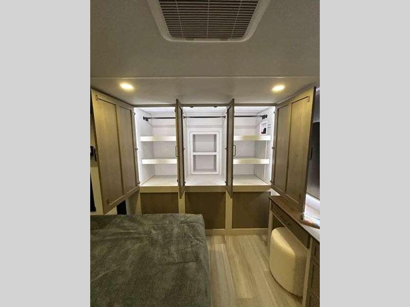 Sleeps 2 Slides 2 Length 31 ft 8 in Ext Width 8 ft Ext Height 11 ft 6 in Hitch Weight 1020 lbs Dry Weight 7563 lbs Cargo Capacity 2257 lbs Fresh Water Capacity 45 gals Grey Water Capacity 60 gals Black Water Capacity 30 gals Available Beds Custom King Refrigerator Type 12V Refrigerator Size 10 cu ft Cooktop Burners 3 Number of Awnings 1 Water Heater Type On Demand Tankless AC BTU 18000 btu TV Info 40" LED Smart TV Awning Info 22' with LED Lights Axle Count 2 Washer/Dryer Available Yes Shower Type Walk-In Shower Electrical Service 50 amp Similar Floorplans