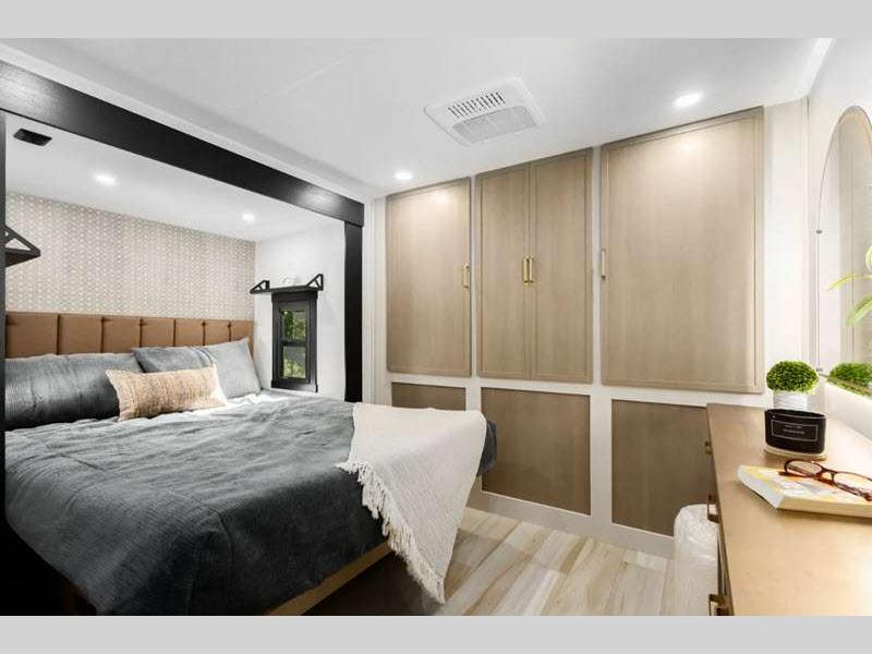 Sleeps 5 Slides 2 Length 34 ft Ext Width 8 ft Ext Height 11 ft 6 in Hitch Weight 1210 lbs Dry Weight 8168 lbs Cargo Capacity 1842 lbs Fresh Water Capacity 45 gals Grey Water Capacity 66 gals Black Water Capacity 30 gals Available Beds Queen with Versa Tilt Refrigerator Type 12V Refrigerator Size 10 cu ft Cooktop Burners 3 Shower Size 30" x 36" Number of Awnings 1 Water Heater Type On Demand Tankless AC BTU 31500 btu TV Info LR 50" LED Smart TV Awning Info 20' with LED Lights Axle Count 2 Washer/Dryer Available Yes Shower Type Walk-In Shower Electrical Service 50 amp Similar Floorplans