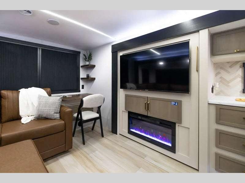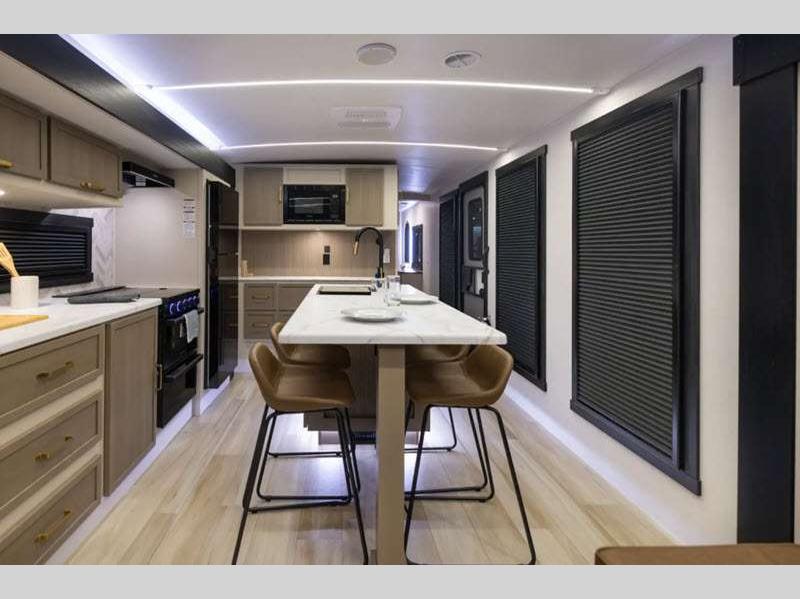 Sleeps 3 Slides 2 Length 33 ft 1 in Ext Width 8 ft Ext Height 11 ft Hitch Weight 1160 lbs Dry Weight 8243 lbs Cargo Capacity 1717 lbs Fresh Water Capacity 49 gals Grey Water Capacity 90 gals Black Water Capacity 30 gals Available Beds Custom King Refrigerator Type 12V Refrigerator Size 10 cu ft Cooktop Burners 3 Number of Awnings 1 Water Heater Type On Demand Tankless AC BTU 31500 btu TV Info LR 50" LED Smart TV Awning Info 19' with LED Lights Axle Count 2 Washer/Dryer Available Yes Shower Type Radius Electrical Service 50 amp Similar Floorplans