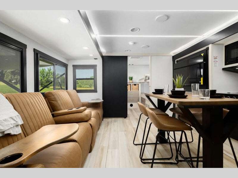 Sleeps 4 Slides 2 Length 35 ft Ext Width 8 ft Ext Height 11 ft 5 in Int Height 0 ft Hitch Weight 915 lbs Dry Weight 8433 lbs Cargo Capacity 1282 lbs Fresh Water Capacity 45 gals Grey Water Capacity 60 gals Black Water Capacity 30 gals Available Beds Queen Refrigerator Type 12V Refrigerator Size 10 cu ft Cooktop Burners 3 Number of Awnings 1 Water Heater Type On Demand Tankless AC BTU 31500 btu Cargo Deck Size 0 ft TV Info 50" LED Smart TV Awning Info With LED Lights Axle Count 2 Shower Type Standard Electrical Service 50 amp Similar Floorplans